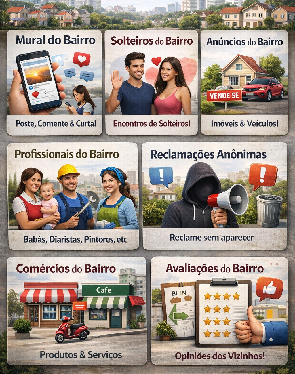Encontre o seu bairro e bora se Cadastrar para ser o primeiro, ou a primeira, a ofertar seus produtos e serviços no bairro. A exibição é por ordem de chegada!